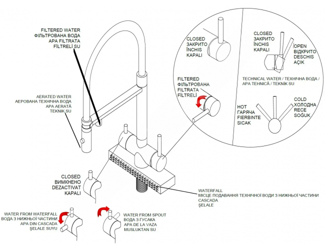 - Comutator separat pentru apă tehnică: alimentare din pipă superioară sau din pâlnia cascadă inferioară