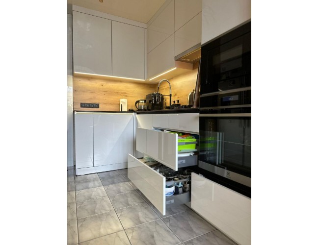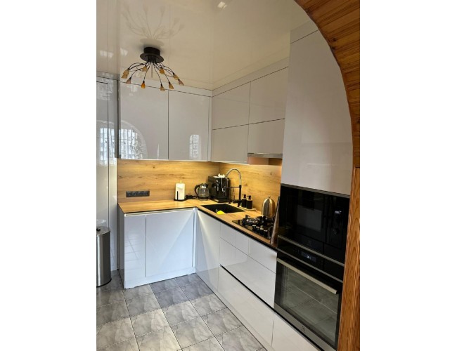 Bucătărie modernă pe colț alb lucios cu blat lemn – design compact și funcțional, Chișinău