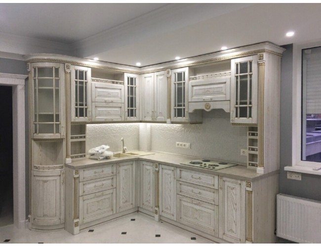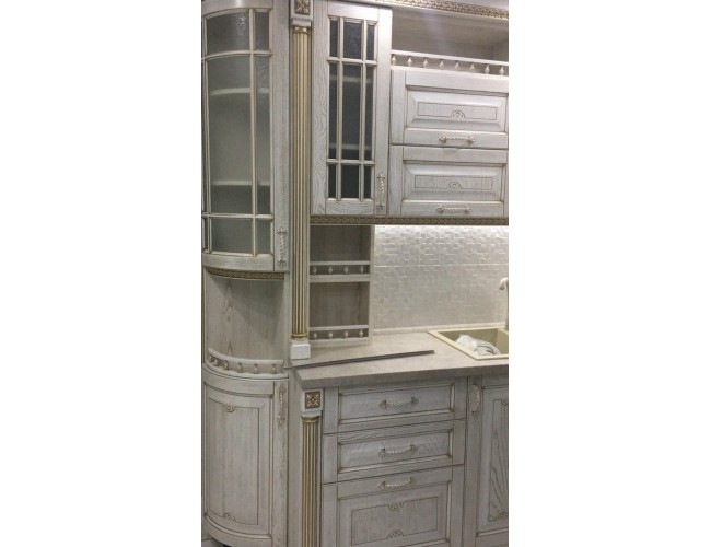 Această bucătărie clasică impresionează prin eleganța rafinată și atenția la detalii. Finisajele în nuanțe deschise, combinate cu elemente decorative aurii și fronturi frezate, creează un ambient luminos și sofisticat, potrivit pentru locuințe moderne sau interioare clasice.