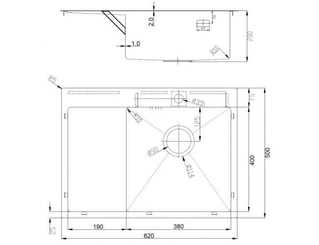 Chiuvetă dreptunghiulară Fabiano BR 62×50 Right