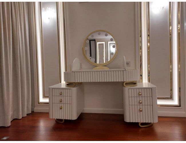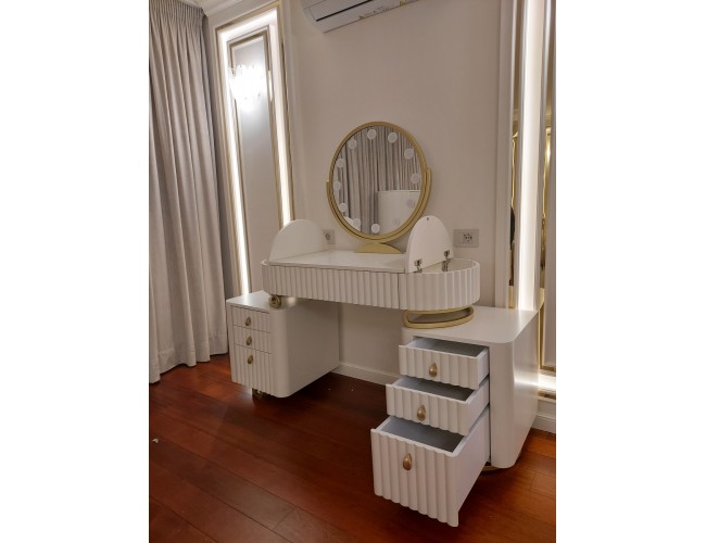 - Organizare eficientă: sertare și spații dedicate pentru cosmetice, parfumuri și accesorii.