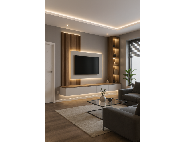 - Compartimentare: panou TV decorativ, corp TV suspendat, rafturi verticale