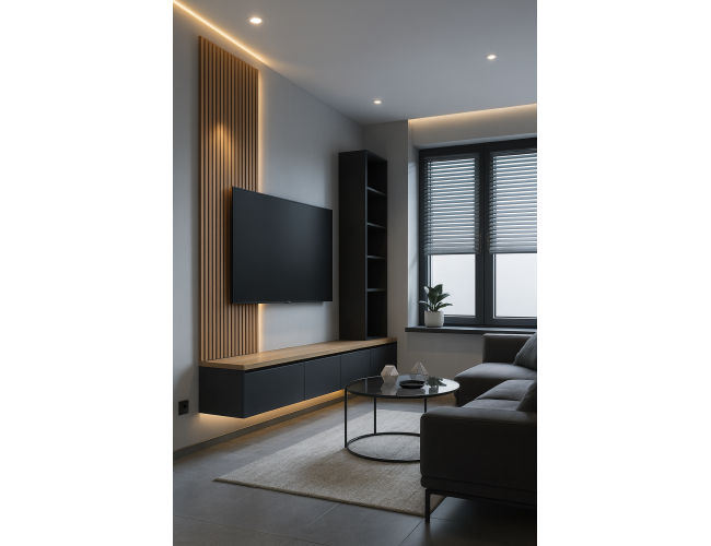 - Compartimentare: panou TV decorativ, corp TV suspendat, rafturi verticale