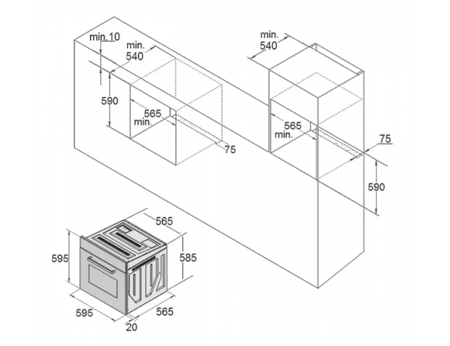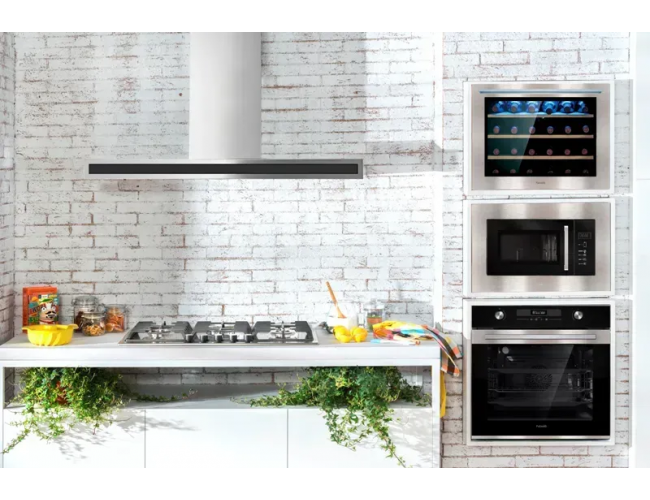 Электрический духовой шкаф с 13 режимами нагрева. Фасад выполнен из закаленного стекла с декоративными полосами из нержавеющей стали. Внутренняя поверхность дверцы — стеклянная и ровная. Оснащен сенсорным таймером, металлической фурнитурой и разборной дверцей. Имеет режим "ECO" (экономичный нагрев), каталитическую очистку, 4 нагревательных элемента и 5 уровней приготовления. Управление комбинированное, встроен электронный термостат и конвектор камеры приготовления. Предусмотрена защита от детей и двойная подсветка камеры.