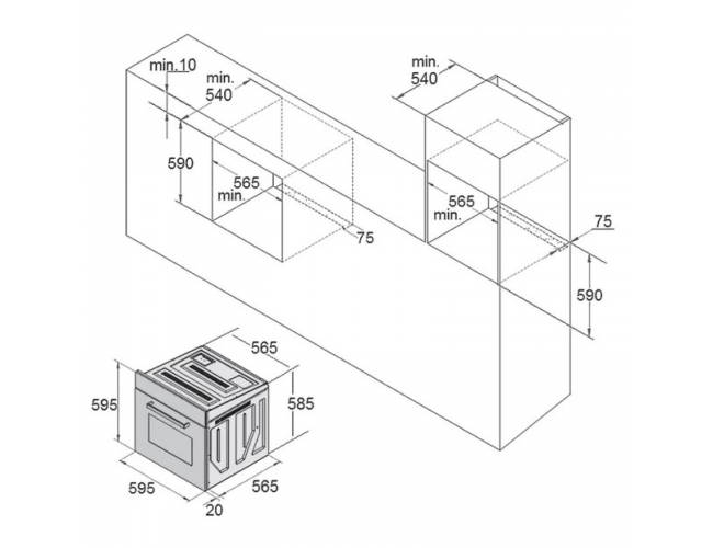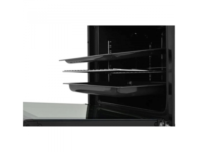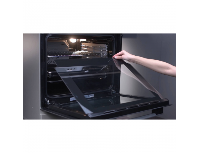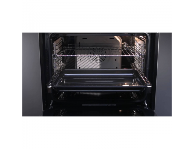 Электрический духовой шкаф объемом 72 литра с 13 режимами нагрева. Оснащен эмалью легкой очистки CRYSTAL CLEAN и системой каталитической очистки. Имеет 4 нагревательных элемента, 5 уровней приготовления, электронный термостат и конвектор камеры. Сенсорный таймер с функциями: часы, будильник, ручной режим, отключение нагрева, быстрый предварительный разогрев. Двойная подсветка камеры, хромированные боковые направляющие и телескопические полозья. Максимальная мощность — 2900 Вт. Диапазон температур: 25–250 °С. Класс энергоэффективности A+.
