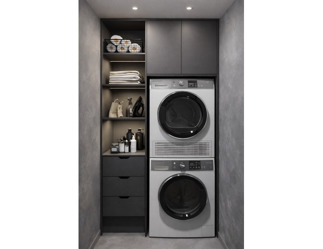 Этот тип мебели может быть выполнен в виде технического шкафа для ванной комнаты/прачечной , с удобными отделениями для всех повседневных нужд. Конфигурация определяется в зависимости от имеющегося пространства и выбранной техники.