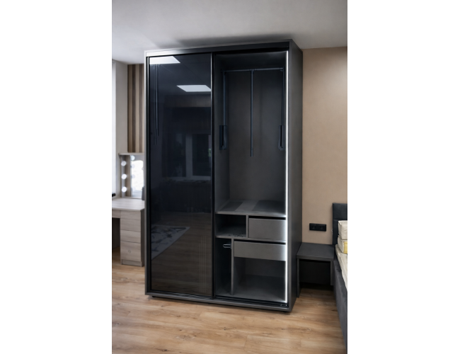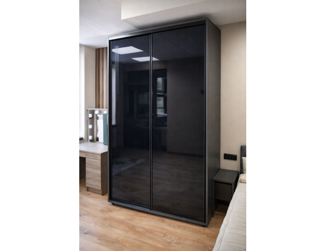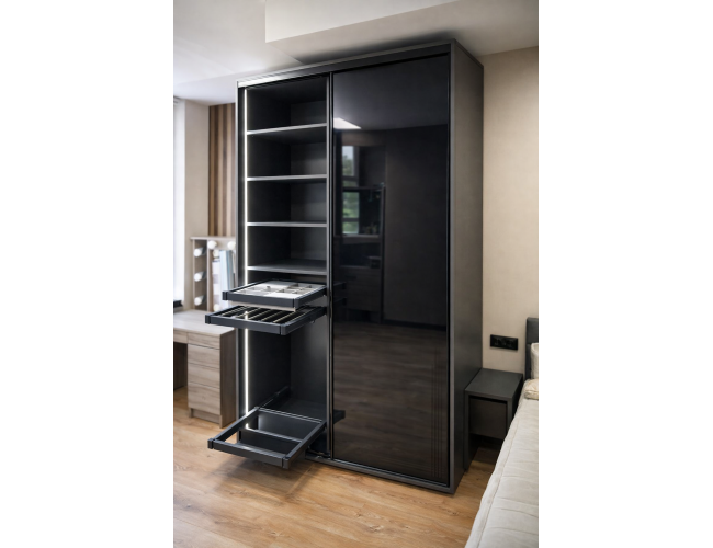 Глянцевые двери из чёрного стекла придают шкафу роскошный внешний вид и визуально расширяют пространство комнаты. Благодаря системе раздвижных дверей шкаф экономит место и обеспечивает удобное ежедневное использование.