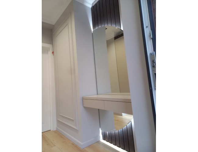 Консоль для прихожей T-50 — стильное решение для современных интерьеров, где важны эстетика и функциональность. Модель включает декоративное зеркало с полукруглой формой, встроенную LED-подсветку и подвесные выдвижные ящики для удобного хранения повседневных мелочей.