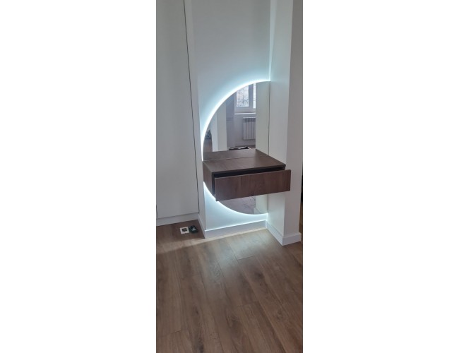 Консоль для прихожей T-53 — стильное решение для современных интерьеров, где важны эстетика и функциональность. Модель включает декоративное зеркало с полукруглой формой, встроенную LED-подсветку и подвесные выдвижные ящики для удобного хранения повседневных мелочей.