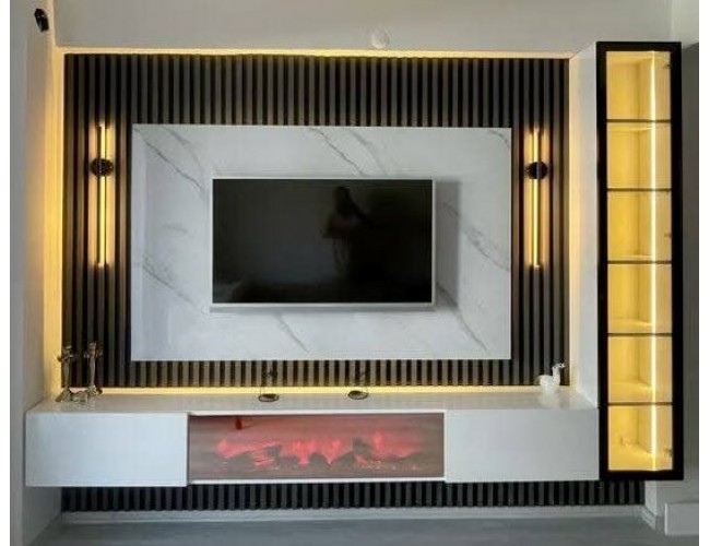 Современная мебель для гостиной, изготовленная на заказ, с современным дизайном и оптимальной функциональностью. Комплект разработан для эффективного использования пространства и придания гостиной элегантного вида.