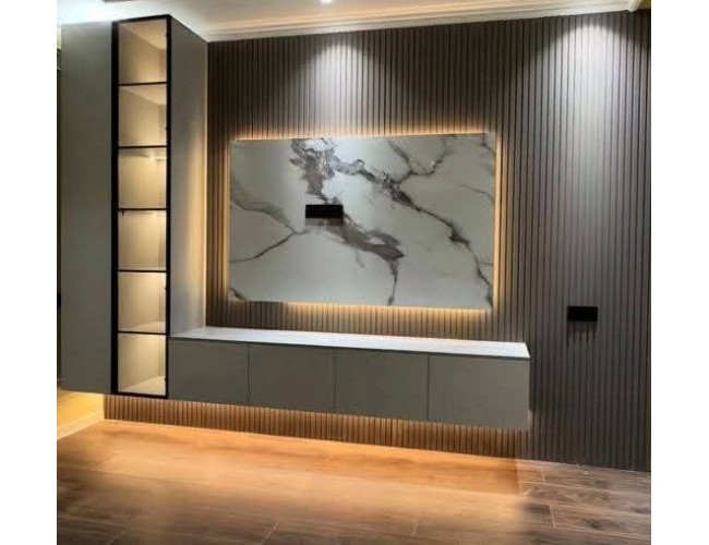 Современная мебель для гостиной, изготовленная на заказ, с современным дизайном и оптимальной функциональностью. Комплект разработан для эффективного использования пространства и придания гостиной элегантного вида.