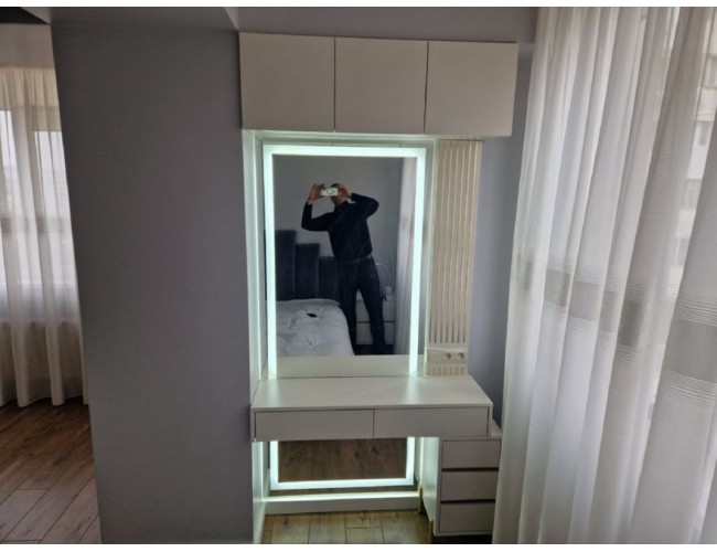 Отправьте нам сообщение с указанием: 1) размеров (Д × Ш × В), 2) желаемого стиля (современный / классический / неоклассический), 3) цвета, 4) типа зеркала (простое или со светодиодной подсветкой), 5) города (Кышинау / другой район), 6) фотографии места установки.