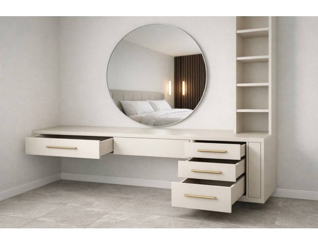 Туалетный столик с зеркалом и ящиками — практичное решение для организации косметики в спальне, гардеробной или гостиной. Он изготавливается на заказ , точно подгоняясь под размеры вашего помещения. Позвоните или напишите нам прямо сейчас и пришлите размеры + фотографию помещения — мы быстро предложим вам ориентировочную цену.
