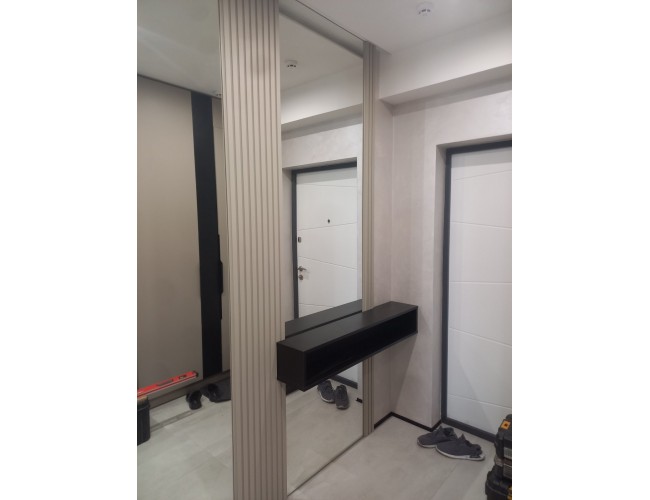 Это зеркало для прихожей выделяется современным и элегантным дизайном, дополненным декоративными вертикальными панелями и минималистичной подвесной полкой. Идеальное решение для создания функционального и стильного пространства у входа.
